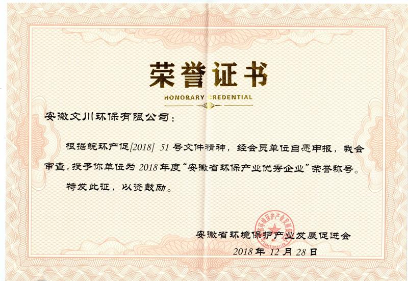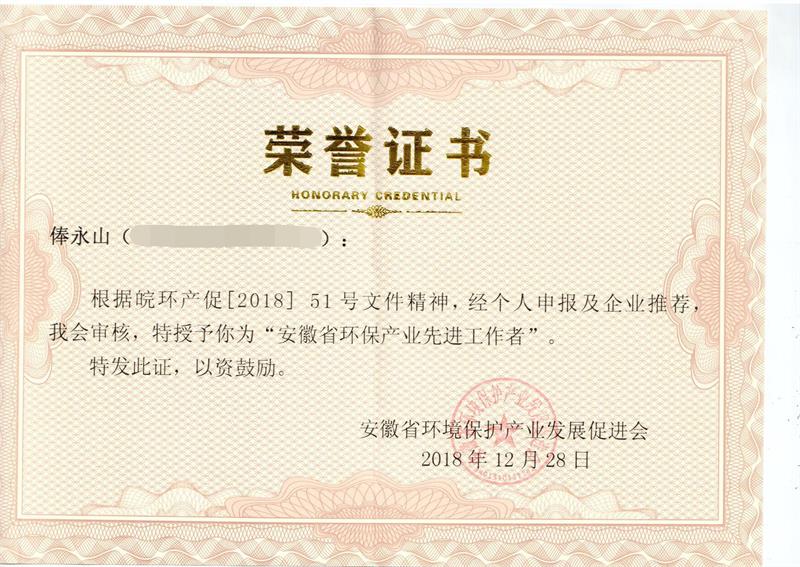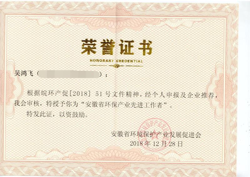 根据《关于申报2018年安徽省环保产业优秀企业及先进工作者的通知》(皖环产促【2018】第51号)文件精神,经过我公司申请及安徽省环境保护产业发展促进协会审核,我公司荣获2018年度“安徽省环保产业优秀企业”荣誉称号,吴鸿飞同志、俸永山同志获得“安徽省环保产业先进工作者”荣誉称号。